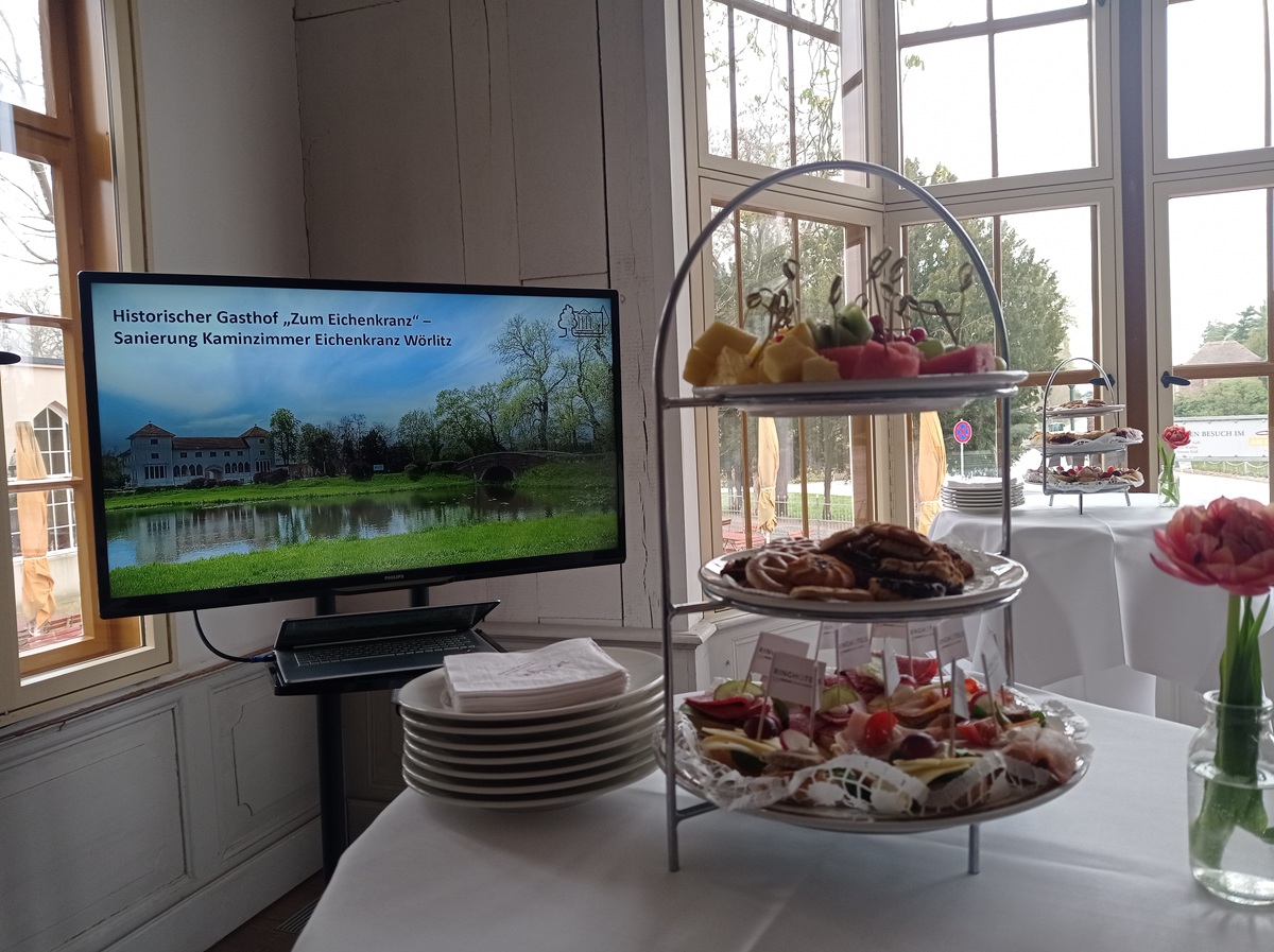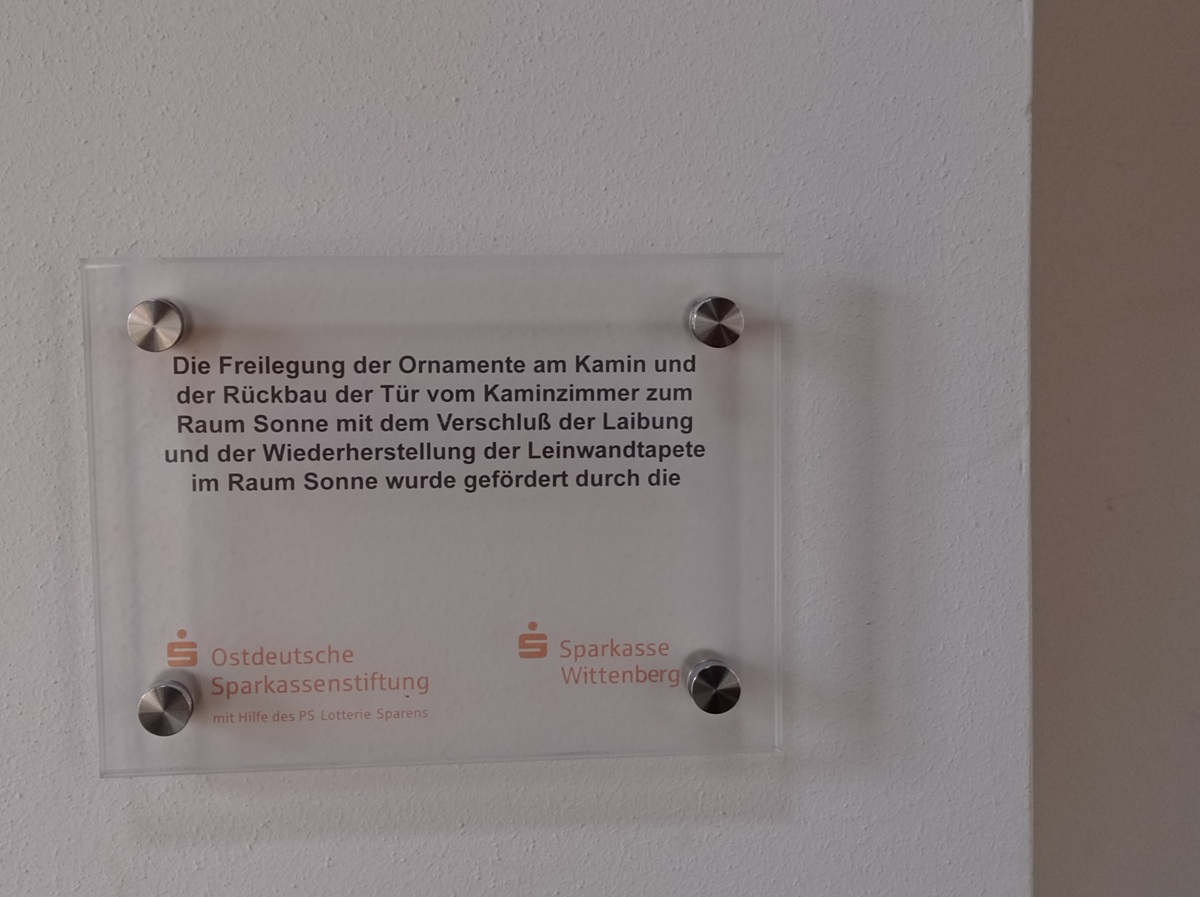 Die im Eingangsbereich enthüllte Förderplakette verweist auf die gemeinsame Förderung der Ostdeutschen Sparkassenstiftung und der Sparkasse Wittenberg. „Der ‚Eichenkranz‘ zählt zu den kulturgeschichtlich bedeutendsten historischen Gasthöfen Deutschlands. Gemeinsam mit der Sparkasse Wittenberg unterstützen wir dieses einzigartige Baudenkmal seit vielen Jahren – beginnend 2009 mit der Restaurierung der wertvollen Leinwandtapeten im Raum ‚Sonne‘“, sagte Patricia Werner. Mit der nun abgeschlossenen Restaurierung des Speisesaals werde einer der zentralen Räume des Gesamtensembles wieder in seiner ursprünglichen Schönheit erlebbar, so die Geschäftsführerin der Ostdeutschen Sparkassenstiftung. Sie hob hervor, dass es ein besonderes Anliegen sei, diese Art kulturelle Schätze zu bewahren und für die Öffentlichkeit erlebbar zu machen.
