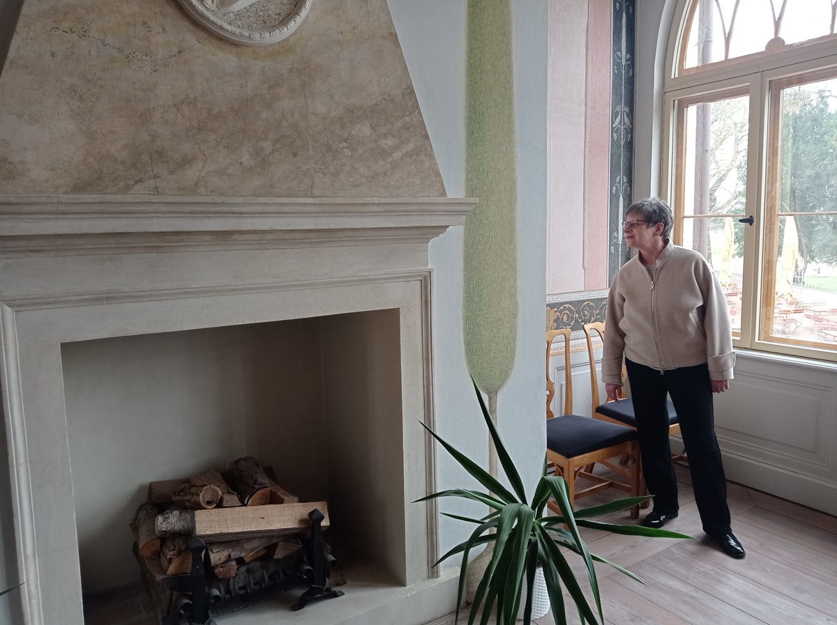 Zwar konnte bereits 2014 die Generalsanierung abgeschlossen, jedoch im Speisesaal weder die Wandflächen (hier ohne Leinentapeten), noch die Decke mit Stuckelementen oder ferner der bauzeitliche Kamin zum Abschluss gebracht werden. Zum einen musste noch die Wandfläche mit den nicht bauzeitlichen Türflügeln zwischen Speisesaal und Raum „Sonne“ zurückgebaut und die dortige Leinentapete erneuert sowie zum anderen der Kamin gemäß heutigen bautechnischen Anforderungen geprüft werden.