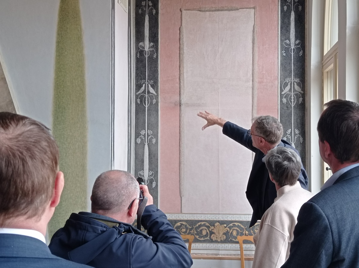 Im Blickpunkt stand dieses Mal der historische Speisesaal. Im Beisein Patricia Werners, Geschäftsführerin der Ostdeutschen Sparkassenstiftung, Thomas Arndts, Vorstandsvorsitzender der Sparkasse Wittenberg, und Maik Strömers, dem amtierenden Vorsitzenden der Gesellschaft der Freunde des Dessau-Wörlitzer Gartenreiches, sowie weiteren Gästen wurden die Ergebnisse der jüngsten Restaurierungsarbeiten präsentiert.