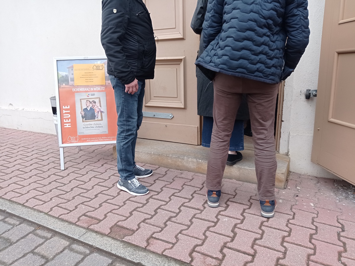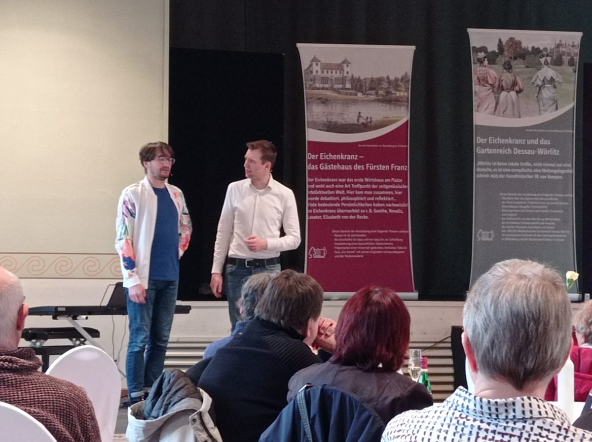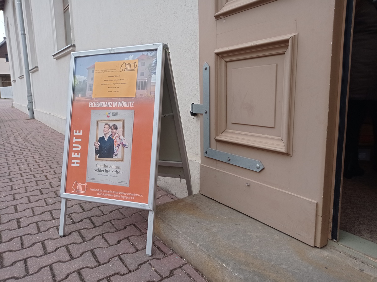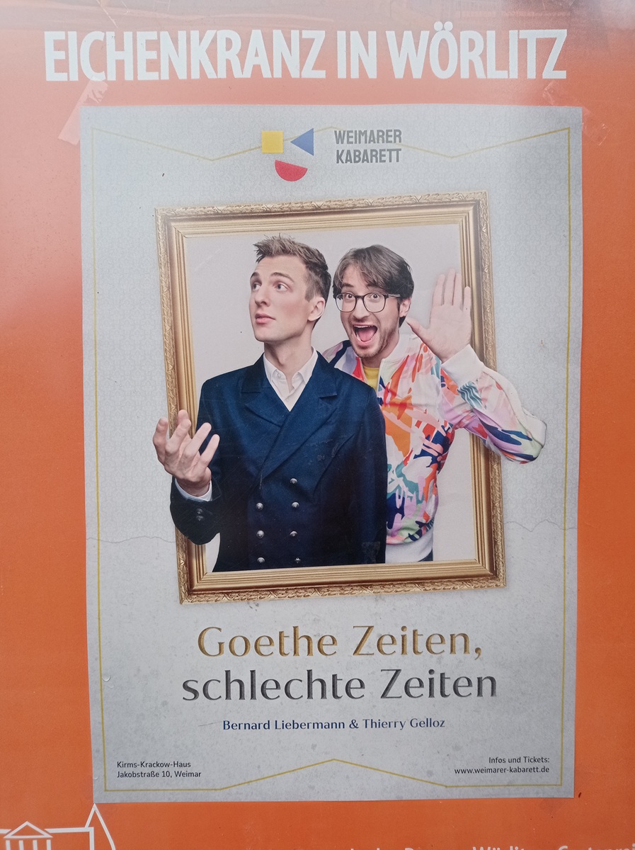 Die Städte Wörlitz und Weimar verbindet nicht nur der Buchstabe W: Nachweislich sieben Mal weilte Johann Wolfgang von Goethe (1749-1832) in Wörlitz, hatte jedoch nie im „Eichenkranz“ logiert. Am 12. April 2026 brachte das Künstler-Duo Bernard Liebermann und Thierry Gelloz vom „Weimarer Kabarett“ den einstigen Dichterfürsten erneut in den Wörlitzer Park und dabei vielleicht zum ersten Mal in den historischen Gasthof. Nun feierte ihre Debüt-Show „Goethe Zeiten, schlechte Zeiten“ aus dem Jahre 2023 hier ihre Premiere.