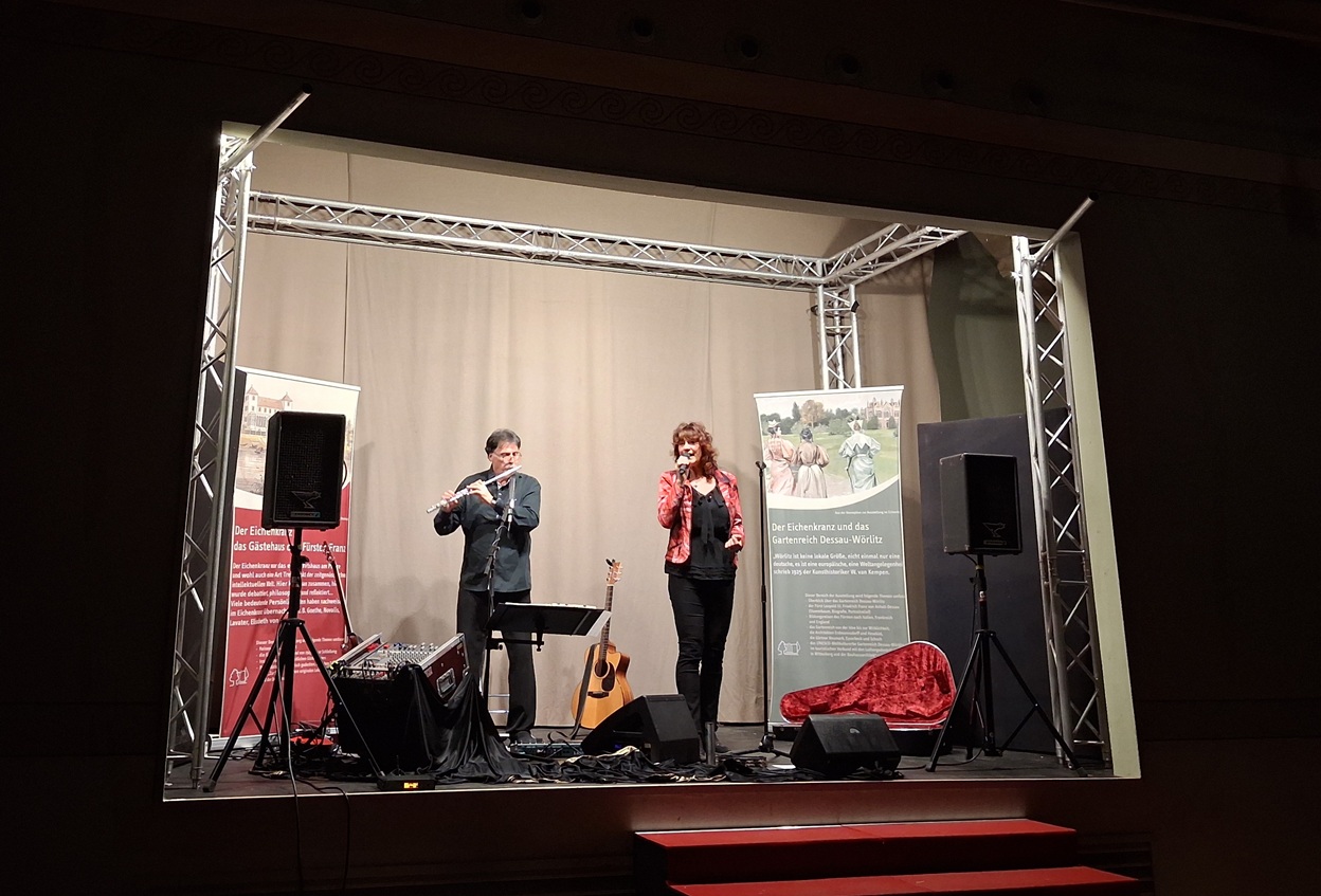 Unter dem Motto „Als ich fortging – Der Soundtrack unserer Jugend“ spielten Sabine Waszelewski und Klaus-Jürgen Dobeneck bekannte Stücke von den Beatles bis Sting und von Renft bis Electra. Das Konzert voller variationsreicher und musikalischer Farbakzente zum Träumen, Erinnern und Mitsingen oder einfach nur zum Genießen sorgte für Stimmung. Das Tanzbein wurde geschwungen. Die mitreißenden, melodiösen Songs und gefühlvollen Balladen wurden per Querflöte, Akustik- und E-Gitarre sowie Percussion interpretiert. Seit 2008 entwickelt das Musiker-Duo seine Konzerte aus unterschiedlichen Genres, verknüpft sie mit verschiedenen Show-Elementen und sorgt für ein unverkennbares Rockfeeling. Zuletzt stand es im März 2025 mit seinem Programm „Ladies Pop“ im Wörlitzer Eichenkranz auf der Bühne.